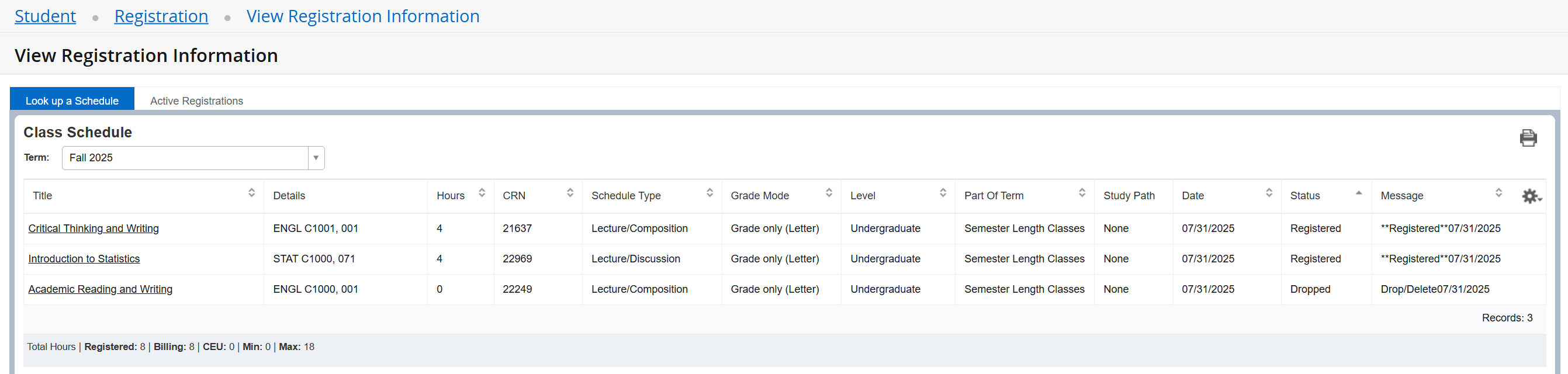 View your registration status, browse the Schedule of Classes, and register for classes through the Registration Dashboard. See below for more information.