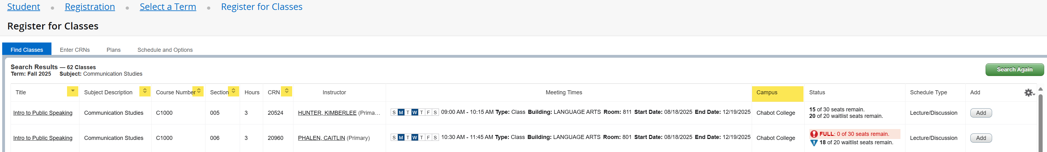 • The course list will be displayed in ascending order by Subject and Course Number. To change the sort order, use the up and down arrows next to the title in the column heading.